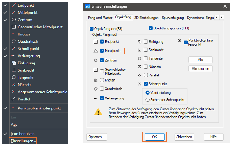 Klicke mit der rechten Maustaste auf das Objektfang-Symbol, um auszuwählen, welche Fangpunkte (z. B. Endpunkt, Mittelpunkt, Schnittpunkt) aktiviert sein sollen. Man kann Shift + rechte Maustaste verwenden, um automatisch auszuwählen.