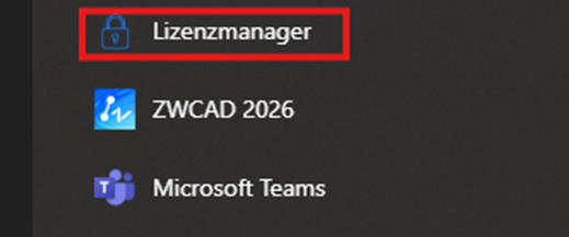 Um eine Lizenz auszuleihen, öffnen Sie den Lizenz-Manager von ZWCAD, der sich im ZWCAD-Ordner im Startmenü befindet.