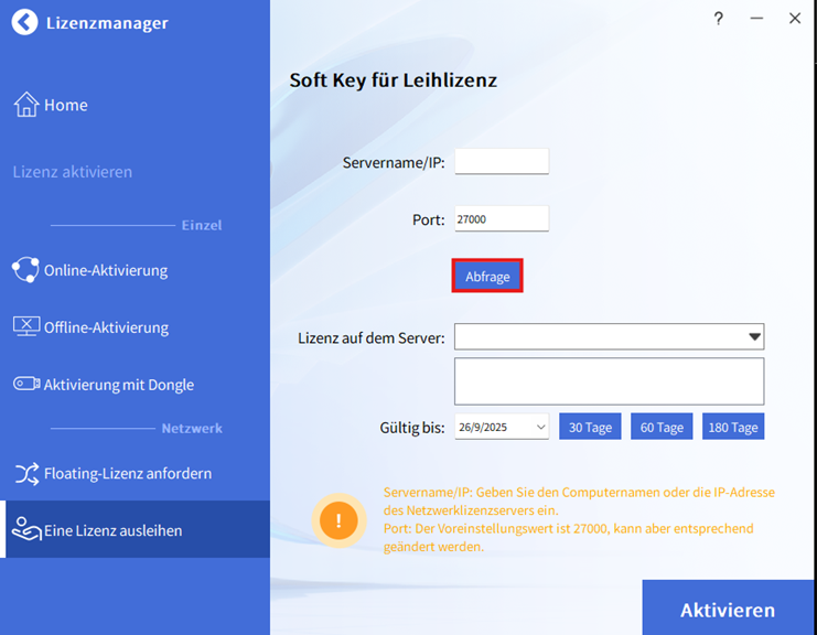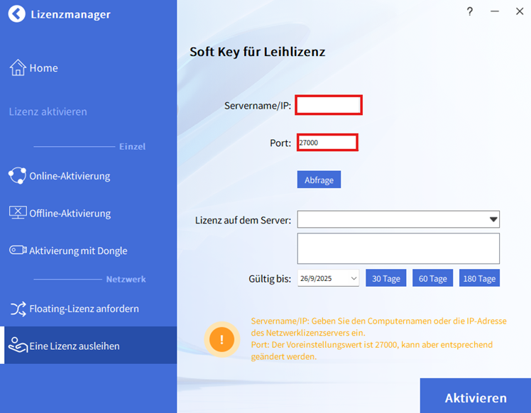 Geben Sie den Servernamen oder die IP-Adresse sowie den mit dem Dienst verbundenen Port an; Standardmäßig ist dies Port 27000. Belassen Sie diesen Wert, es sei denn, Sie haben in den Optionen Ihres Netzwerklizenz-Managers einen anderen Wert konfiguriert.